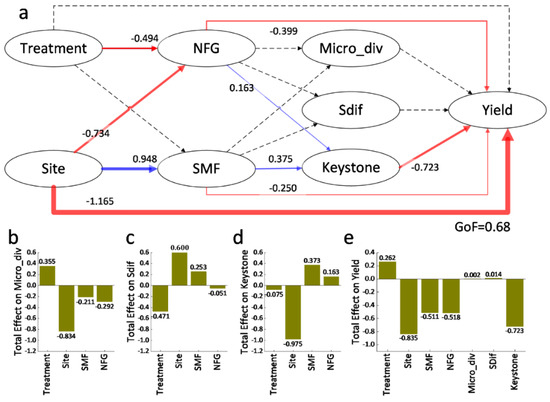 Partial least squares path modeling of the effects of treatment; site; copies of functional genes involved in N cycling (NFG); and soil multifunctionality, including soil properties and C metabolism-related enzyme activities (SMF); bacterial and fungal diversity (Micro_div); ASVs that are significant enriched by different treatment based on MetagenomeSeq analysis (Sdif); and keystone taxa in the combined bacterial–fungal ecological networks (Keystone) on rice production (yield). Values in the graph (a) are path coefficients that indicate the direct relationships between latent variables, and values are reflected by the width of the arrows. Blue and red arrows indicate positive and negative correlations, respectively. The dashed arrows represent path coefficients that are not significantly different from zero (p > 0.05). The significance levels were determined based on 1000 bootstrapped resamples. The goodness of fit (GoF) index evaluates the overall predictive performance of the model. The composition and values of total effects on Micro_div (b), Sdif (c), Keystone (d), and yield (e) are also shown in the graph.