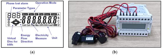 Figure 3a depicts the LCD display of the PA310 Clip-on CT Smart Power Meter. The LCD display serves as the user interface, providing real-time data and information regarding energy consumption, voltage, current, power factor, and other relevant electrical parameters. It offers a user-friendly interface for navigating through different menus, configuring settings, and viewing energy usage data. The display may include various features, such as backlighting for readability in various lighting conditions, numeric and graphical representations of data, and navigation buttons for ease of use. Figure 3b showcases the PA310 Clip-on CT Smart Power Meter as part of the Smartmeter line. This device is designed for accurate measurement and recording of both AC (alternating current) and DC (direct current) electrical parameters. It is equipped with advanced clip-on CT technology, allowing for non-intrusive installation and measurement of electrical currents without interrupting the circuit. The Smartmeter line may include various models and configurations tailored to different energy monitoring needs, with the PA310 being a prominent example. These meters are capable of monitoring power usage, voltage levels, current flow, power factor, and other critical parameters, enabling users to track and analyze energy consumption effectively for improved efficiency and cost management.