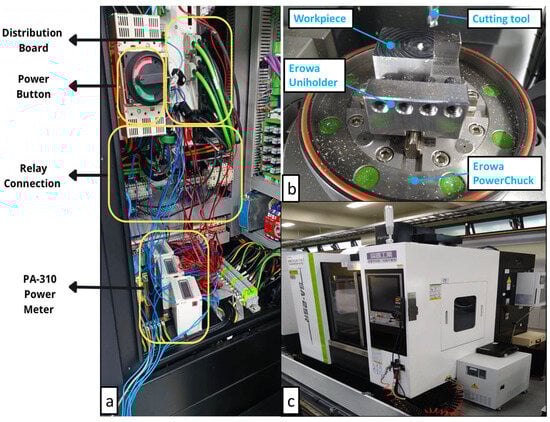 (a) PA-310 power meter is installed to measure the current and voltage on the CNC 5-axis machine panel; each Smartmeter is dedicated to measuring the output of each axis motor, which are X, Y, Z, C, A, and the spindle speed motor; (b) Setup of workpiece on Erowa clamping system; (c) Hartford 5A-25R 5-axis Machining Center manufactured by SHE HONG INDUSTRIAL Co., Ltd., Taichung, Taiwan.