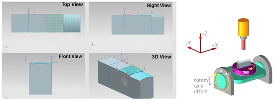Furthermore, we varied the cutting parameters to study their impact on power consumption. We experimented with different widths of cut of 1–3 mm, depths of cut of 0.5–1.5 mm, and spindle speeds of 4000, 6000, and 8000 rpm during the cutting process, as shown in Figure 5. The top-right view allow us to observe how the tool engages with the workpiece along the patterns, which is essential for comprehending the power requirement, and these variations allowed us to analyze power consumption patterns under different cutting conditions. We designed a circular cutting path to involve the C-axis cutting. The cutting tool follows circular paths in the C-direction until the entire surface is completely cut. Throughout this process, the base of the turning table continuously rotates in the C-axis, allowing us to observe the power consumption in this axis. The obtained experimental results present the power consumption values of the X-, Y-, Z-, A-, and C-axes of the servo motor and the spindle motor and illuminate the specific energy requirements of each component during machining.