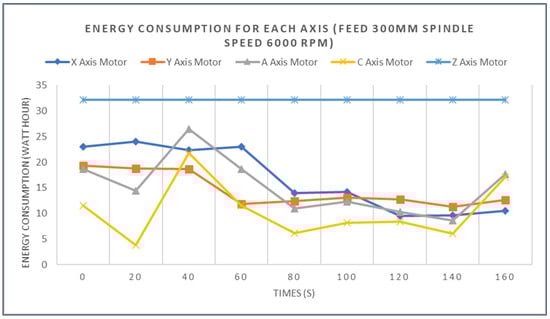 The provided data seem to represent the energy consumption (in Wh) and time (in seconds) associated with different machining configurations for the X-axis motor, Y-axis motor, A-axis motor, C-axis motor, and Z-axis motor under various feed rates. Each row corresponds to a specific machining scenario denoted by the tool type (X), the feed rate, and the specific configuration within that category (spindle speed 6000 rpm). The provided data appear, as shown in Figure 6, to be a tabular representation of various machining parameters and energy consumption values for different machining processes and tools. Upon analysis, it is evident that each row corresponds to a specific machining scenario, denoted by a code indicating the type of cut (e.g., A, C, X, Z), the specific tool used, and additional parameters, such as feed rate and time.
