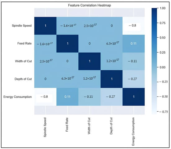 In this research, built upon the current milling process data using a CNC five-axis machine, the correlation coefficients between the considered four factors are depicted in Figure 7. It is notable that for certain factors, such as the spindle speed, feed rate, width of cut, and depth of cut, positive correlations are represented by darker shades of blue and negative correlations are represented by lighter shades of blue to conduct a more comprehensive assessment of the performance of the machine learning models. The results of the correlation analysis show that two factors have a strong correlation: spindle speed and energy consumption.