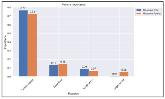 The broader comparison of machine learning regression and classification methods introduces a noteworthy observation—most classification approaches surpass expectations in regression and show lower errors. The subsequent exploration of Decision Tree and Random Forest classifiers in constructing predictive models for power consumption and its independent variables reveals their viability. In particular, the significance of spindle speed is underscored in Figure 10, which demonstrates a substantial deviation in its importance compared to other features. This implies that analyzing results solely based on spindle speed can provide valuable insights; however, the experiment emphasizes the imperative of a comprehensive examination of all features. This underscores the nuanced interplay between spindle speed, width of cut, feed rate, and depth of cut, reinforcing the importance of evaluating features’ importance comprehensively for a holistic understanding of their collective impact on overall information comprehensiveness. In essence, these analyses deepen our understanding of the intricacies involved in selecting and interpreting machine learning models and features, providing valuable insights for predictive accuracy in the context of energy consumption prediction in CNC machining processes.