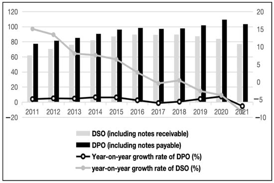 In the context of this policy, supply chain finance defaults have been occurring one after another, exemplified by cases such as the Shanghai steel trade fraud, the Guangdong pulp case, and the Qingdao non-ferrous metal case. While supply chain finance has expanded the financing channels of SMEs, there are still many challenges to be addressed for supply chain finance to further promote the sustainable development of the real economy. Presently, the key issue within China’s supply chain finance lies in designing financing solutions centered on core enterprises, which are yet harmonized with the entire supply chain. However, these core enterprises take advantage of this situation to extend the payable period to upstream and downstream suppliers, thereby reducing their financial costs but inadvertently increasing the financial pressure on SMEs. To more clearly demonstrate this point, an examination of the primary operating capacity data from China’s listed companies reveals (The data are obtained from the annual financial data of all A-share listed companies (excluding ST and financial industry companies) from 2011 to 2021. The figures are created based on information from the iFinD database.) two notable trends. Firstly, the cash conversion cycle (CCC) of core enterprises in supply chain finance shortens due to the extension of days payable outstanding (DPO) (see Figure 1). Secondly, while the days sales outstanding (DSO) of core enterprises exhibit a predominantly downward trend, the DPO continues to rise (see Figure 2). This implies that supply chain finance injects more liquidity into core enterprises, while non-listed companies situated upstream and downstream in the supply chain, especially SMEs, are confronted with increasing cash flow pressure. Core enterprises, already having sufficient cash, may invest more funds in the financial market driven by profit-seeking motives, whereas cash-strapped SMEs find it increasingly difficult to obtain funds for production. This vicious cycle prevents supply chain finance from effectively lubricating the real economy by alleviating liquidity pressures for SMEs and instead exacerbates the financialization of non-financial enterprises.