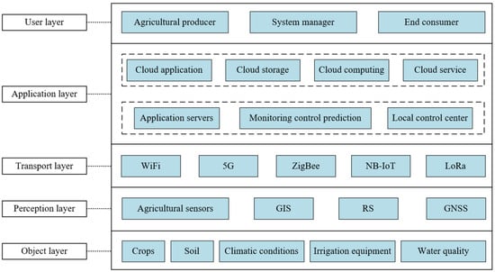 Most people divide IoT architecture into three layers: the perception layer, the transport layer, and the application layer [16]. This division not only cannot accurately characterize the characteristics and differences of IoT technology in specific industrial applications but also does not reflect the characteristics and differences of specific users. In order to overcome these two shortcomings, some people divide the agricultural IoT system architecture into five layers. That is, the user layer, application layer, transport layer, perception layer, and object layer [20,21]. The functions, components, and relationships of each layer are shown in Figure 1.