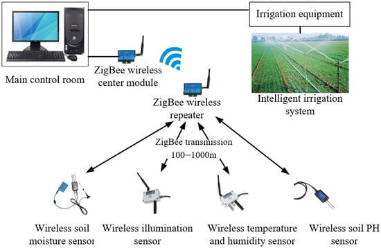 ZigBee is a wireless network protocol that features low-speed and short-distance transmission. It adopts the media access layer and physical layer of IEEE 802.15.4 standard [67] specification as its bottom layer. The name “ZigBee” is inspired by the communication method used by bees in bee colonies to transmit food location information to their companions through the “Zigzag” dance [68]. In a ZigBee network, the bees flying freely in the colony manifest as nodes, and collecting honey from different places is equivalent to sensors collecting data. The process of sending honey to the hive for honey brewing is similar to sending collected information to the host computer for data processing [69]. ZigBee is characterized by reliable transmission, short delay, large network capacity, low power consumption, and a low data transmission rate. ZigBee networks are easy to operate and rely on wireless communication methods. Three main network topologies are available, including star topology, tree topology, and mesh topology. Figure 2 shows a schematic diagram of the application of ZigBee technology in agricultural irrigation.