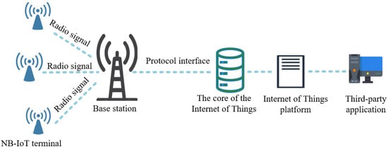 NB-IoT, also known as low-power wide area networks, is a narrowband IoT technology. It is an IoT communication technology that has evolved from 3G/4G cellular communication and operates in dedicated licensed frequency bands. NB-IoT covers a wide range and supports massive connections [70] while offering strong anti-interference ability and high data security as it is organized according to the authorized spectrum. NB-IoT meets many IoT communication needs that cannot be wired and has a wide coverage. The basic architecture of NB-IoT [71] is shown in Figure 3, with three deployment methods available: independent, protection band, and in-band deployment.