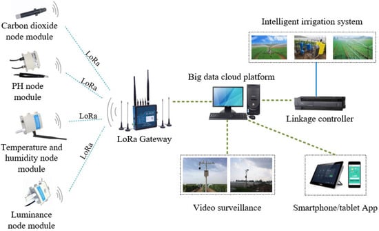 Lyu et al. [37] developed a vineyard irrigation control system that utilizes LoRa technology. By combining LoRa wireless communication technology with a dynamic neural network, they created a soil moisture prediction model. The control terminal connects sensors to collect crop growth data and uses LoRa technology to remotely operate pumps, valves, and other equipment. Andrada et al. [38] also created a rural irrigation system using LoRa technology. The system communicates via LoRa and can send trigger signals and calculate water demand to initiate irrigation. Additionally, data are sent to the ThingSpeak cloud through LoRa for monitoring, and the positioning of LoRa devices is determined by optimizing distance and antenna. Mallikarjun et al. [39] designed a farm irrigation control system based on LoRa technology. The system incorporates soil moisture sensors, LoRa transmitters and receivers, MCU modules, and servers. The combination of LoRa technology and MCU modules ensures the secure transmission of soil moisture data from the field to the server, while the data are visualized in various forms. Farmers without internet experience can remotely analyze the state of their fields with ease. Torre-Neto et al. [40] developed a soil measurement probe that uses a multi-depth sensor and communicates through LoRa technology. The collected data are transmitted to the cloud platform network via LoRa technology, where it can be viewed and analyzed by users. Gloria et al. [41] created a sustainable irrigation system that utilizes the IoT. The hardware nodes responsible for collecting sensor data communicate with each other through LoRa technology and with the server through MQTT, sending data to be stored and analyzed using algorithms. Li et al. [42] developed a water-saving irrigation system for greenhouses that utilizes LoRa and GA-BP. They established a GA-BP crop water demand prediction model and built a demonstration and verification system using LoRa technology networking. The irrigation system collects agricultural environmental factors as input for the prediction model, and the model’s irrigation output is fed back to the server via Android APP monitoring software. This enables accurate irrigation and automatic irrigation completion. Vyas et al. [73] designed an efficient fog layer aggregation algorithm for intelligent agriculture that supports LoRa. This algorithm compresses the total amount of IoT data to be uploaded to the cloud, significantly reducing the data volume transmitted to the cloud. It addresses the issue of LoRa communication being unsuitable for transmitting large amounts of data due to its low bandwidth. Ji et al. [74] developed a visualization monitoring solution for agricultural IoT based on LoRa. They reduced the data volume by only sending image patches of modified regions, thereby reducing the utilization of LoRa bandwidth.
