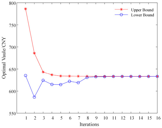 The iterative process of the solution is shown in Figure 3. With continuous iteration, the difference between the upper and lower bounds of the model decreased and, finally, after 16 iterations, the model converged to 633.16 Chinese yuan (CNY).