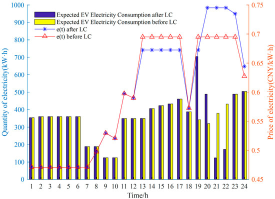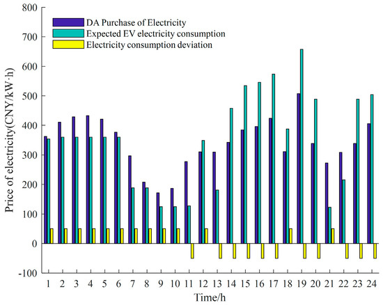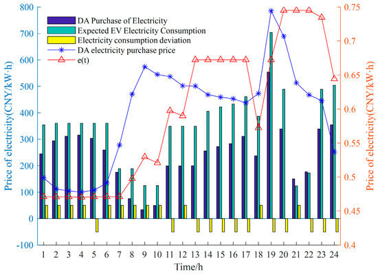 Figure 4 displays the EVA’s day-ahead (DA) electricity purchase and pricing decision(e(t)), along with the EVA’s day-ahead electricity purchase price, expected EV electricity consumption, and worst deviation electricity consumption under this decision. The figure shows that the EVA’s charging and discharging prices were higher than the day-ahead electricity purchase price only during the periods 13–17 and 20–24. In other words, the EVA incurred a loss when selling electricity to customers for most of the next day. The reason for this was that market rules limited the EVA’s ability to provide EV users with a price for charging and discharging that exceeded the average price of day-ahead electricity purchases for the entire day. This meant that the EVA needed to adjust user behavior by increasing the price of electricity, while also setting a low price to comply with market rules at other times. Therefore, under the constraints of market rules, the EVA needed to sacrifice some of its own interests to encourage users to change their electricity consumption behavior.