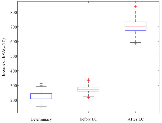 To verify the effectiveness of robust pricing, this study set the upper and lower bounds of the time period boundary and the aggregate boundary of deviation to 0. This meant that the uncertainty of electricity consumption was not taken into account, resulting in the optimal decision of the EVA under deterministic conditions. Based on the historical real-time price of electricity, 1000 sampling simulations were conducted under different conditions. The deviation of electricity in the simulation was a random number uniformly distributed: [–50, 50]. It is important to note that the EVA’s optimal decision under deterministic conditions did not meet the market rule constraints for real-time electricity purchases and sales in 5622 time periods out of 1000 simulations. To ensure the completeness of the sampling data, the sampling simulation of the optimal decision of the EVA under deterministic conditions did not restrict its real-time purchase and sale of electricity. The resulting income scenarios for the optimal EVA decision are shown in Figure 8 under deterministic conditions, considering uncertainty but not participating in load curtailment, and considering uncertainty and participating in load curtailment.