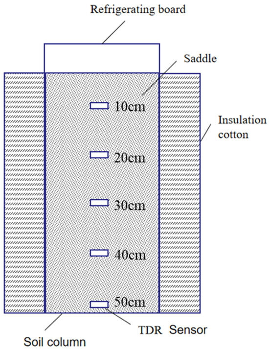 A one-way soil freezing test (Figure 1) was conducted in a cylindrical periclase tank (15 cm internal diameter, 50 cm height). Insulation materials were wrapped around the sides and bottom of the test device to ensure an internal insulation effect and one-way freezing of the soil samples. The NX-05AS refrigerant was placed on top of the soil sample, and a time-domain reflectometry (TDR) sensor was buried every 10 cm in the side hole of the glass groove to record real-time changes in the soil sample temperature and moisture content.