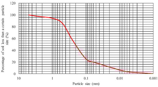 Step 1: The test preparation complied with the standard [25] for geotechnical test methods. The soil samples were dried in a drying box at 105 °C ± 2 °C for 12 h and placed in a dryer to cool before being removed and weighed. After weighing, the soil samples were placed in the oven until the quality of the samples remained unchanged. This experiment used the Malvern 3000 instrument to measure particle size, and the results showed that the soil particles were mostly between 0.15 and 1.5 mm in size, confirming that the sample was composed of fine sandy soil. The cumulative curve of the soil particles is shown in Figure 2.