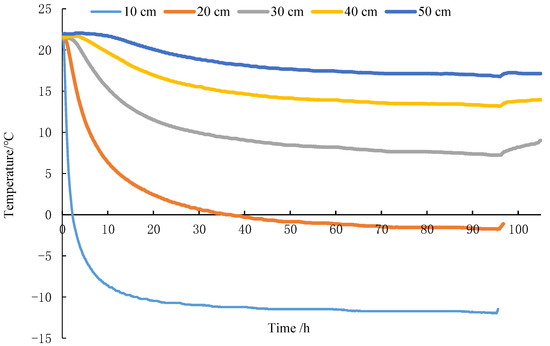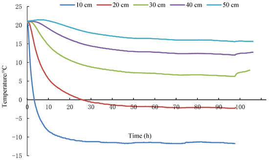 The temperature changes at different freezing temperatures of each layer in real-time, as measured by the TDR sensor, are shown in Figure 3 and Figure 4. The two figures show that the temperature field of each soil sample tends to stabilize after 100 h, and the temperature change over time can be divided into sharp, slow, and stable stages. During the sharp cooling stage of 0–12 h, the soil samples froze faster in the shortest time and the slowest time at 50 cm from the freezing plate. A slow cooling stage occurred at 12–73 h, and the temperature remained stable from 73 h to the end of the experimental phase. The closer the test soil sample was to the freezing plate, the more significant the temperature change. The water in the soil sample turned into ice, causing the soil sample to freeze, and the temperature sharply decreased over a short period, releasing a large amount of heat. When the different freezing temperatures were compared, the sharp cooling phase at −35 °C was shorter than the sharp cooling phase at −20 °C. This is because lower temperatures at the cold end led to a faster freezing speed and a shorter duration of the rapid freezing stage.