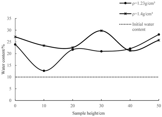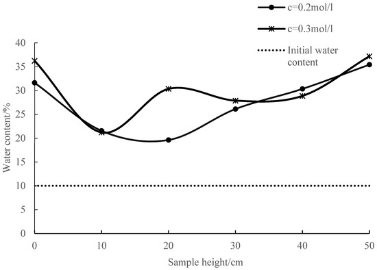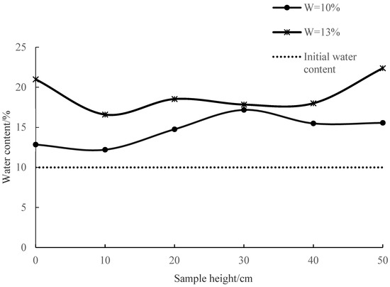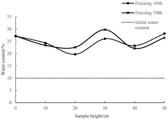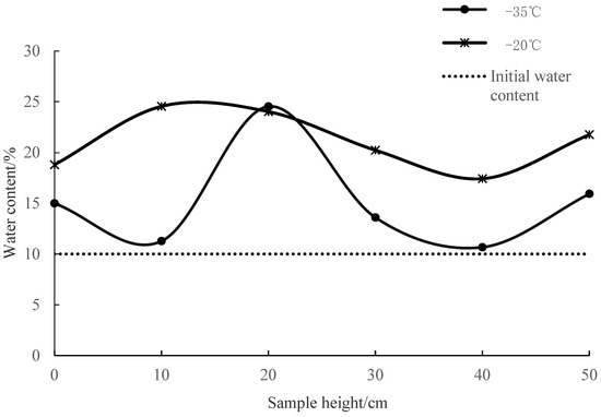 Figure 7. The moisture migration curve in the soil of different initial water content. Note: ρ = 1.53 g/cm3, c = 0.1 mol/L, solute NaCl, freezing temperature −35 °C, after 104 h of freezing.