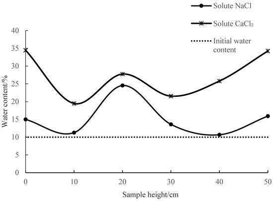 Figure 10 shows the water migration curves in the soil for different solute species at the same freezing temperature, initial water content, freezing time, solute concentration, and soil density. The figure shows that adding different types of salt to the soil sample significantly affected soil sample water migration. The water migration curves were similar regardless of whether the solute species was NaCl or CaCl2. When the solute was CaCl2, the soil sample water content fell rapidly at the cold end, from 34.47% to 19.48%. When it was NaCl, the soil water content decreased slowly from 14.99% to 11.27% at the cold end. The water content of the cold and warm sections was almost the same, regardless of whether the solute was CaCl2 or NaCl. When the solute was CaCl2, it was 34.47% and 34.25%, respectively. When it was NaCl, the water contents were 14.99% and 15.93%, respectively. Furthermore, it was found that NaCl had the strongest water transfer capacity. By contrast, CaCl2 blocks water movement and has poor water transfer capacity. The soil water content with a CaCl2 solute is always higher than when the solute is NaCl.