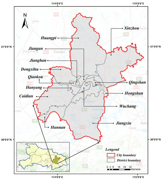 Wuhan, the capital city of the Hubei Province, China, is geographically positioned between 29°58′ N to 31°22′ N latitude and 113°41′ E to 115°05′ E longitude, situated in the eastern part of the Jianghan Plain and the middle reaches of the Yangtze River. The city is comprised of six central urban districts and seven peripheral districts (as detailed in Figure 1), covering an administrative area of 57,943.92 km2 and hosting a substantial permanent resident population of 31.9874 million [40]. Wuhan is characterized by its varied topography in all directions, particularly at the confluence of the Yangtze and Han rivers, which forms the unique geographical layout of “Two Rivers and Three Towns”. The city experiences a subtropical humid monsoon climate, with abundant rainfall and sufficient heat throughout the year, boasting an average annual temperature between 15.8 °C and 17.5 °C. It possesses an exceptional ecological environment, serving as a confluence for a vast array of plant species from both northern and southern regions. Nearly half of the city’s area is covered with green vegetation, providing more than the expected average of 10 square meters of green space per capita. These ecological assets are vital for Wuhan’s endeavor to become an ecological civilization city and stand at the core of its environmental protection objectives [41].