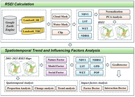 In this context, we take Wuhan, a rapidly urbanizing city in central China, as a case study. As a major industrial base and transportation hub, urban ecology in Wuhan, Hubei Province, China is relatively fragile and unstable, more susceptible to the impacts of human economic activities [39]. Therefore, it is in urgent need of systematic and dynamic ecological quality monitoring and assessment. This study implements the RSEI model on the GEE platform to evaluate the spatiotemporal patterns of ecological quality in Wuhan from 2001 to 2021 based on Landsat imagery. The OPGD model is further applied to analyze the driving factors behind the ecological quality dynamics. The main innovations of this study include (1) integrating GEE and RSEI for efficient urban-scale ecological quality assessment, overcoming the limitations of data acquisition and processing in previous studies; (2) characterizing the long-term ecological quality dynamics under rapid urbanization using multi-temporal remote sensing data; and (3) quantifying the influence of natural and anthropogenic factors on ecological quality patterns with the OPGD model, providing decision support for urban ecological planning and management.