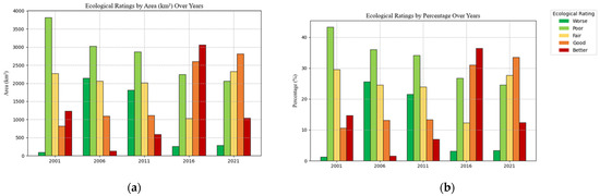 Area and proportion of Wuhan EQ classification areas from 2001 to 2021. (a) Area of different grades; (b) proportion of different grades.