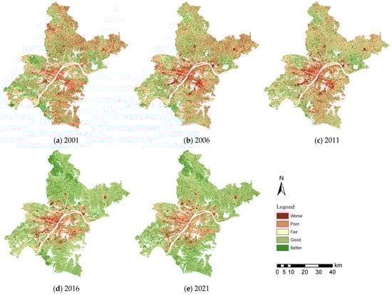 The PCA of Wuhan City’s four indicators in 2001, 2006, 2011, 2016, and 2021 (see Table A1) reveals that the eigenvalue contribution of the first principal component consistently surpasses 50%, signifying its representation of the majority of information across the four indicators. Therefore, this principal component can substitute for the four components of greenness, wetness, dryness, and heat. To minimize the influence of subjective factors in the composite of multiple indicators, the variance contribution rate is selected as the weight for each component indicator. Utilizing these weights, a comprehensive evaluation model for the RSEI is constructed to conduct an in-depth assessment of EQ in Wuhan. The contribution rate of greenness has been increasing over the study period, indicating that the ecological protection has improved in Wuhan in recent years, resulting in a positive trend in vegetation cover and its increasing impact on the overall EQ compared to other indicators. Similarly, the contribution rate of the heat indicator is rising, reflecting the continuous increase in Wuhan’s surface temperature during the study period, which is closely related to the urban heat island effect, thereby increasing the weight of the heat indicator in the RSEI evaluation. In the annual first principal component, the greenness (NDVI) and wetness (WET) indicators are positive, suggesting a beneficial impact on the ecological environment, while the dryness (NDBSI) and heat (LTS) indicators are negative, indicating potential adverse effects. High values of greenness and wetness suggest good vegetation cover and soil moisture content, reflecting a favorable EQ. Conversely, high dryness and heat values may indicate issues like sparse vegetation, exposed bedrock, soil desertification, and urbanization, signifying poor ecological conditions. Since other principal components do not show significant trends or clear reflections of EQ, this study only utilizes the contribution rate of the first principal component to construct the RSEI [51].