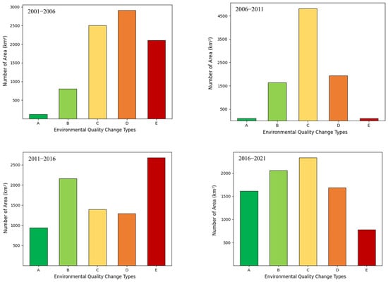Changes in EQ type area in Wuhan City from 2001 to 2021. Note: A. Significant Improvement; B. Mild Improvement; C. Unchanged; D. Mild Deterioration; E. Significant Deterioration.