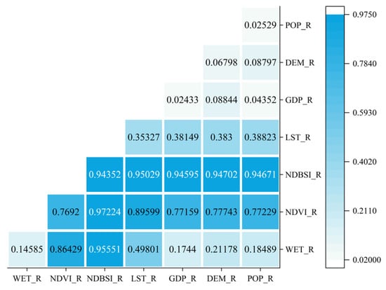 To detect the interactions between various factors, this study evaluated whether the interaction between every two independent variables enhances or weakens the explanatory power on the dependent variable. The interaction detection analysis, conducted using a geographical detector model, categorized the results into bifactor enhancement and non-linear enhancement, as shown in Figure 7. The analysis indicates that, compared to individual influencing factors, all interaction factors significantly amplify the impact on the spatial heterogeneity of the dependent variable RSEI. Key interaction factors with a relatively high impact on RSEI’s spatial heterogeneity include NDVI ∩ NDBSI, WET ∩ NDBSI, LST ∩ NDBSI, NDBSI ∩ GDP, NDBSI ∩ DEM, and NDBSI ∩ POP, demonstrating that interaction factors have a more substantial effect on spatial heterogeneity. The detection results of differentiation factors revealed that slope and aspect have minimal impact on RSEI values; hence, their interactions were not included in the result analysis.
