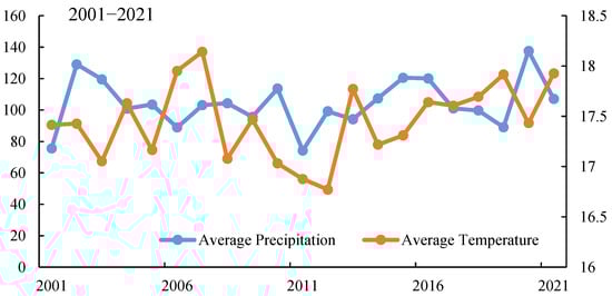 Changes in average annual temperature and precipitation in Wuhan from 2001 to 2021.