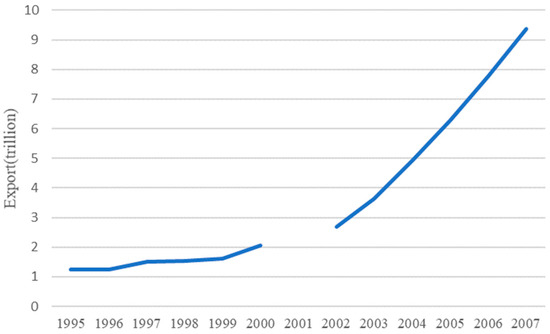This paper deals with two enterprise micro-databases: the China Industrial Enterprise Database and the China Enterprise Pollution Database. In this paper, the two databases are matched by name and year and processed as follows: (1) Samples of industrial firms with less than 8 employees or missing or negative paid-in capital and gross industrial output are deleted. (2) Samples with missing main explanatory variables in the pollution database are deleted. The final result is 293,469 observations involving 118,806 firms. This paper sets the study sample period as 1998–2007, mainly based on the following considerations: First, the identification strategy of this paper aims to observe the difference between the treatment group and the control group in the time dimension. Second, after China’s accession to the WTO, there was an explosive growth in exports brought about by a sharp decline in import tariff rates. As shown in Figure 1, there is a significant difference in the growth rate of exports before and after China’s accession to the WTO, which provides a rare quasi-natural experiment for this paper to identify the impact of trade on environmental pollution in China. Finally, after 2007, with the outbreak of the financial crisis in the U.S., the trade environment in China and rest of the world underwent profound changes. For example, China’s foreign trade dependence began to decline after reaching a peak of 64.4% in 2007, and an overly long research sample will cause the empirical results of this paper to be disturbed by other factors.