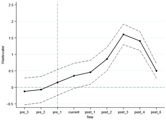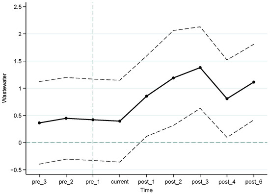 The premise of using the double-difference method is that the treatment group and the control group must satisfy the parallel trend test; that is, there must be significant difference in wastewater discharge between the treatment group and the control group before China’s accession to the WTO. In this paper, according to the event analysis method, time series dummy variables are set before 2001 and substituted into the model for regression. The specific results are shown in Figure 2. The difference between the treatment group and the control group is not significant before China’s accession to the WTO, and after China’s accession to the WTO, the treatment group shows a significant upward trend in wastewater discharge; therefore, the parallel trend test is passed. There is an obvious dynamic trend in the effect of trade liberalization on the pollution emissions of enterprises, and the coefficient begins to decline after the third period of China’s accession to the WTO, which may be related to the Chinese government’s increasing focus on the quality of economic growth and increasing environmental regulation.
