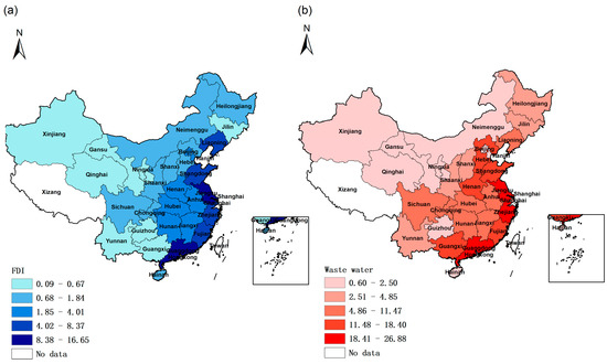 According to the theoretical analysis in the previous section, this paper supports the pollution paradise hypothesis based on the entry of foreign capital. The entry of foreign investment in China has a very obvious geographical characteristic, as shown in Figure 5a, which shows that foreign investment in China is mainly concentrated in the coastal areas. In addition, the most significant areas of industrial wastewater discharge in China are also concentrated in the coastal areas (see Figure 5b). This suggests that there may be a correlation between the entry of foreign investment and corporate pollution emissions.