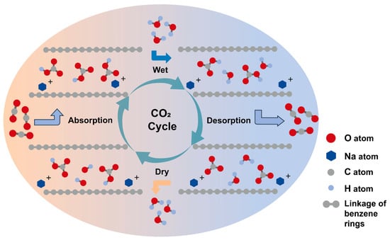 The fundamental mechanism underpinning the proposed CO2 capture method is governed by changes in ambient humidity, primarily involving the hydration and dehydration processes of ions within ion exchange resins [19,31]. Cations on the surface of an ion exchange resin (IER) play a pivotal role in disrupting the crystal structure of sodium carbonate (Na2CO3) [2,22]. This disruption fosters an environment conducive to the independent hydration of carbonate ions, leading to either a reduction or an increase in the number of water molecules within the hydration cloud of these ions. The resultant variation in hydration numbers is central to the moisture-driven CO2 adsorption and desorption process [32].