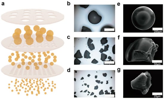 Particle grinding and screening of different diameters. (a) Schematic illustration of screening resin particles within different diameter ranges. (b) Optical microscopy image of resin particles in the >0.58 mm range, scale bar 200 μm. (c) Optical microscopy image of resin particles in the 0.28–0.40 mm range. (d) Optical microscopy image of resin particles in the 0.074–0.16 mm range. (e–g) SEM of resin particles in different range. (More in Supplementary Materials.)