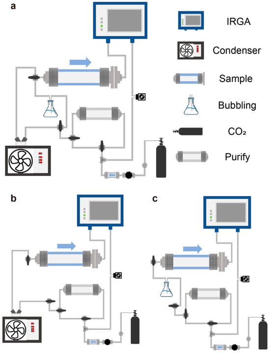 Experimental setup schematic. (a) Comprehensive schematic of the experimental setup, including the sample chamber, infrared gas analyzer (IRGA), dehumidification pathway, humidification pathway, CO2 pathway, and purification section. (b) Schematic of the dehumidification and adsorption cycle apparatus. The gas enters the sample chamber through a condenser, readings are obtained by IRGA, and a micro air pump facilitates the circulation of the gas. (c) Schematic of the humidification and desorption cycle apparatus. Gas humidification is achieved through bubbling, passing through the sample chamber, IRGA for readings, and subsequent circulation facilitated by a micro air pump.