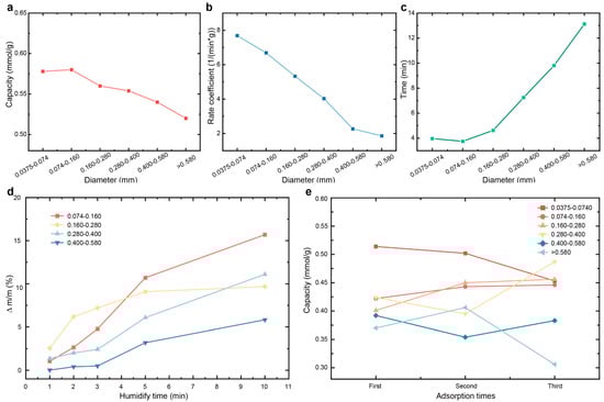 In the experimental assessment of material adsorption and desorption characteristics, a primary variable under consideration is ambient humidity. This study emphasizes the necessity to delineate the rate of hygroscopic adsorption across varying particle dimensions, as it potentially influences the temporal span requisite for a material’s transition from hydrated to anhydrous states during the desorption–adsorption cycle (refer to Figure 4c,d). Consequently, it is imperative to quantify the kinetics of moisture uptake by particles of diverse diameters at a fixed humidity level within a specified temporal frame.