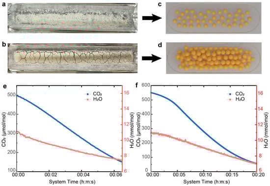 Through testing, we found that in the case of sparse stacking (resin particles spread thinly on the inner wall of a quartz boat, refer to Figure 5c), the absorption of CO2 from 500 ppm to 150 ppm takes only about 6 min. In contrast, in the case of dense stacking (several layers of particles overlapping, forming a block-like structure in the dry state, as observed in the optical microscope images, refer to Figure 5d), the same absorption process requires about 20 min. It can be concluded that the stacking density directly affects the absorption rate. One possible reason is that the airflow within densely stacked particles is extremely slow (as indicated by the COMSOL simulation result of flow velocity < 0.00001 m/s, see Supplementary Materials). Therefore, in future practical applications, it is essential to ensure a certain airflow velocity within the material.