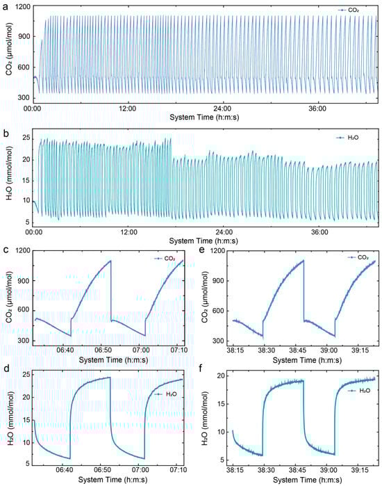 Results after approximately 100 cycles of simulating real-world applications with resin particles in the range of 0.074–0.16 mm: (a) Changes in the system CO2 concentration during the adsorption–desorption process. Each adsorption and desorption cycle starts from 500 ppm, ensuring reliability by maintaining consistent times around 10–20 min. It can be observed that, after a few initial cycles of instability, the amount of adsorption and desorption CO2 stabilizes in subsequent cycles. After about 70 cycles, there is a slight decrease in the absorption rate; however, the stability of absorption capacity remains unchanged. (b) Variation in system moisture content during the adsorption–desorption process. (c,d) An enlarged view of two specific cycles, illustrating that desorption begins immediately with increasing humidity, while adsorption takes some time to initiate due to the need for the material’s internal moisture reduction. Consecutive adsorption–desorption cycles at the initial stage of the experiment, within the first few dozen cycles. (e,f) The images of two consecutive cycles after a slowdown in absorption rate show that the efficiency and capacity of adsorption remain unchanged. The variation in adsorption rate may be attributed to the resin particles becoming less sensitive to the adsorption and desorption of water.