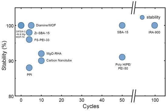 The capacity stability comparison of various sorbents through multiple cycles, with the number of cycles annotated on the graph.