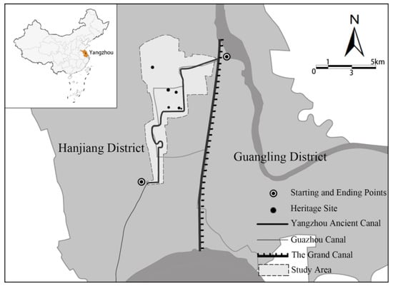 Geographic location of Yangzhou Ancient Canal (data from http://www.gchgis.com/ accessed on 6 May 2023).