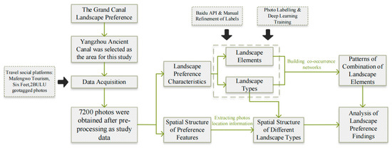 A cognitive framework of Chinese Grand Canal landscape preference was constructed (Figure 2) consisting of two parts: landscape preference characteristics and landscape preference spatial structure. The framework was used to analyze Chinese Grand Canal landscape preference. The experimental data was obtained from geotagged photos on tourism media platforms using a Python crawler program (Octopus Collector-8.6.7). The raw data was pre-processed by cleaning, filtering, and refining image attribute information. When analyzing the characteristics of landscape preference, the image content of geotagged photos is used to determine public preferences for the landscape elements, types, and combinations of different landscape types in Yangzhou Ancient Canal. Customized landscape element multi-labels and landscape type single labels are obtained using API combined with manual refinement. Experimental data was randomly sampled to create a training set. The resulting labels were added to each photo. Object detection models and image classification models were built, trained, and evaluated to recognize the landscape elements in the photos and the landscape types to which the photos belong. Co-occurrence networks with multiple labels for elements in different landscape types are constructed. Social network metrics are used to calculate and summarize element combination patterns. The spatial structure of the landscape preferences is analyzed by transforming the geographic information contained in the pictures into spatial point elements. The degree of aggregation is observed with the help of a GIS platform.