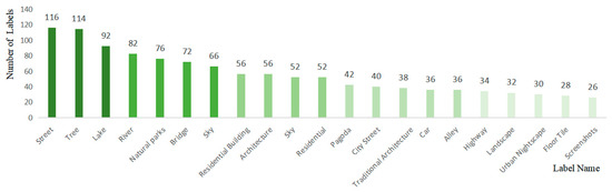 Based on related literature studies [34,43], it is recommended that the training set should consist of approximately 5% of the sample size. Therefore, a total of 500 photos were randomly selected from the cleaned and screened geotagged photo dataset to serve as the training set, accounting for 6.6% of the overall sample. The model labeling, training, and evaluation were conducted accordingly. To improve the reliability and comprehensiveness of landscape element labeling, Baidu Intelligent Cloud’s pre-trained generic object and scene recognition API interface was utilized to predict the training set photos prior to manual labeling. Each photo was assigned 5 labels with confidence scores, and a total of 318 labels with confidence scores exceeding 0.5 were filtered out. The histogram in Figure 3 passively displays the top 20 high-frequency labels obtained through collation, thereby identifying the constituent elements of the photos.
