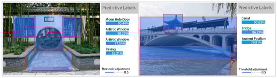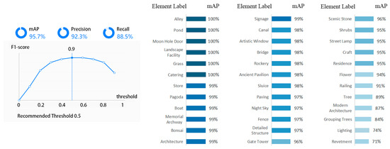 After multiple rounds of correcting the prediction results and iterative training, the object detection model performs optimally at a confidence level of 0.5. It has a precision rate of 92.3%, a recall rate of 88.5%, and a mAP of 95.7%. These results indicate that the model is excellent and can accurately predict the landscape elements of the Yangzhou Ancient Canal (Figure 4). The mAP values for different labels are shown in Figure 4, and all labels have a mAP greater than 70%. The precision and recall of each label were satisfactory. Batch prediction of all 7600 geotagged photos with the trained object detection model yields landscape element labels with a confidence threshold greater than 0.5 for each image (Figure 5).