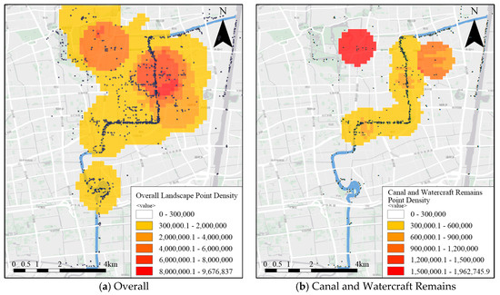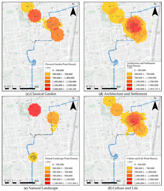 Photo density can be used to reveal the public’s spatial preferences for landscapes (i.e., high-density photos reflect high visitation rates and preferences) [39]. Overall (Figure 6a), photos are mostly concentrated in the northern half, with only Canal Sanwan Park in the south being relatively concentrated. The northern half of the Dongguan Historical and Cultural Tourism Area is the most densely photographed area, and this area includes many popular tourist attractions such as Dongguan Street and Ge Garden, making it the most frequently visited location by the public for photos and maps. The Slender West Lake Scenic Area follows with a higher concentration of photos, while photos along the banks of the Yangzhou Ancient Canal show an even distribution along the canal.