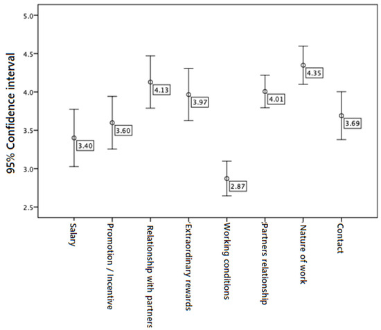| Relationship with superiors. | 4.05 | 1.78 | 4.43 | 1.78 | 3.95 | 1.74 | 0.826 | 0.441 |