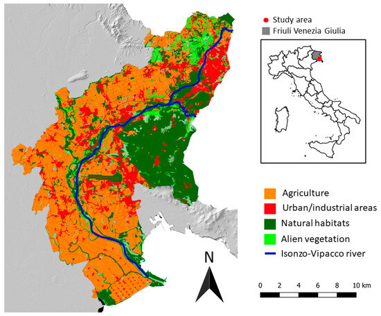 The area is rich in biodiversity representative of four different biogeographical areas: Po Valley, Illyrian-Balk, and Mediterranean in connection with the Alpine system. The related habitats are mainly concentrated along the rivers and arranged in a north–south direction, while in the east–west direction, they are reduced and fragmented due to anthropic land use change. This includes both agricultural activities (including intensive agriculture based on the irrigation system) and the expansion of urban, commercial, and industrial settlements. The floodplain areas are characterized by tree formations dominated by black poplar (Populus nigra L.) while the riverbed hosts willow thickets of Salix eleagnos Scop. and Salix purpurea L., often contaminated by invasive exotic species (e.g., Robinia pseudacacia L., Amorpha fruticosa L. and Reynoutria japonica Houtt.). In the Karst area, downy oak (Quercus pubscens Willd.) and black hornbeam (Ostrya carpinifolia Scop.) formations can be found, while in the alluvial plain, residual strips of mesophilic woods represent a fragmented but very important hot spot of biodiversity [35].