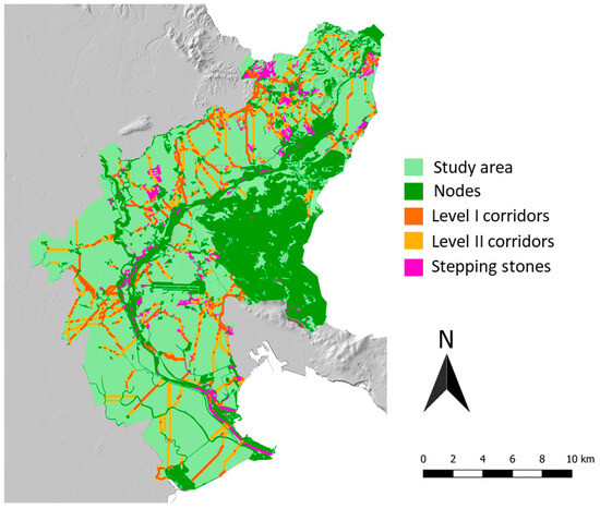 Map of the proposed ecological network, highlighting nodes, corridors (level I and II), and stepping stones.
