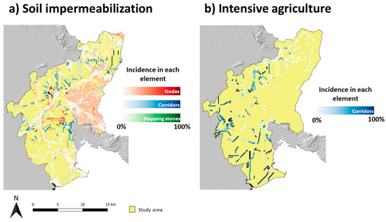 Incidence of soil sealing (a) and intensive agriculture (b) in the elements of the proposed ecological network. Color intensity is linked with impact incidence: for each network element (individual nodes, corridors or stepping stones, respectively, in red, blue, and green) darker colors are linked with a higher % area subjected to either soil sealing or intensive agriculture. Perfect white represents lack of soil sealing or intensive agriculture in the network element.