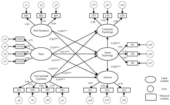 From Table 4, it can be seen that the Cronbach’s Alpha values of the six latent psychological variables in this study range from 0.64 to 0.86, all greater than 0.5, indicating that the overall reliability of questionnaires is good [38]. The KMO values are all greater than 0.5, meeting the demands of validity. Research has shown that results are ideal when AVE > 0.5 and CR > 0.6 [39]. The CR values of the latent psychological variables used in this study are all greater than 0.6, the AVE value of inertia psychology is 0.43, and the AVE values of the other latent variables are all greater than 0.5. Specific results are shown in Table 4, indicating the good internal consistency between latent variables and their high convergence validity. In this study, the above indicators should be considered comprehensively. It can be seen that the reliability and validity of the questionnaires are good. The obtained data have confirmed credibility and can be used for subsequent analyses.