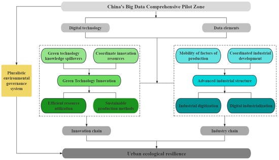 Over the past few decades, China’s economy has expanded roughly and developed effectively. This resource-dependent mode of production has led to increasingly prominent environmental problems, seriously weakening the carrying capacity of the environment, reducing the regional ecological resilience, and posing a major threat to China’s ecological security []. The Chinese government, in its report to the 20th National Congress, underscored the importance of integrating carbon reduction, green expansion, pollution reduction, and economic growth to improve China’s ecological environment. In 2023, General Secretary Xi Jinping explicitly indicated in the Conference on Environmental and Ecological Protection that “we must continue to fight a good battle against pollution in depth; adhere to the precise and scientific treatment of pollution in accordance with the law; maintain the strength, extend the depth, expand the breadth, and deeply promote the three major defence wars of blue sky, blue water, and clean soil”. To address the conflict between economic advancement and ecological conservation within the framework of high-level urban development and to improve cities’ ecological resilience, a prompt resolution is necessary []. The China big data comprehensive pilot area policy is a unique policy pilot area created by the state to utilize data as a central component, foster scientific and technical innovation, and expedite the advancement of industrial digitization and digital industrialization, serving a significant purpose. The implementation of a series of industrial support policies, data resource opening policies, talent support policies, infrastructure construction policies and innovation support policies, and other policies and measures in a specific area aims at data flow driving capital flow, technology flow, talent flow convergence and circulation, the development of digital technologies, digital industries, digital business forms, and digital models. The establishment of the China big data comprehensive pilot zone aims to optimize the benefits of big data and its many uses while facilitating the integration of the digital economy in various sectors. This initiative also presents a significant opportunity to enhance urban ecological environments and strengthen urban ecological resilience.