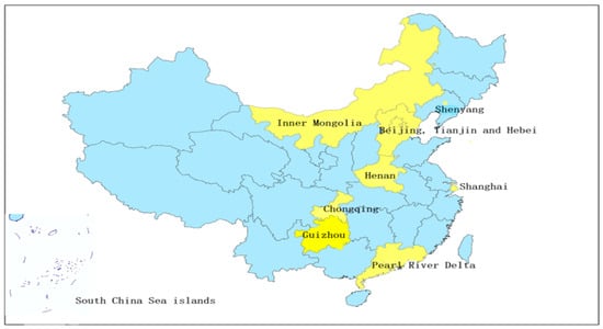 In this research, the primary explanatory variable is China’s comprehensive big data pilot zone policy (Big_datait). If city i becomes a pilot zone in year t, it is assigned a value of 1; otherwise, it is assigned a value of 0. According to the pilot list released by the relevant authorities in turn and the availability of city data, the experimental group in this paper is the 51 prefecture-level cities in the pilot list. The first sample of the experimental group includes 4 prefecture-level cities, and the second sample includes 47 prefecture-level cities. The policy starting points are set to 2015 and 2016. The remaining 166 prefectural-level cities not included in the list serve as the comparison group. Figure 2 illustrates the spread of policy implementation throughout China’s big data comprehensive pilot area. The portion of the figure depicted in dark yellow represents the initial set of big data comprehensive pilot zones, while the portion represented in light yellow represents the subsequent set of big data comprehensive pilot zones.