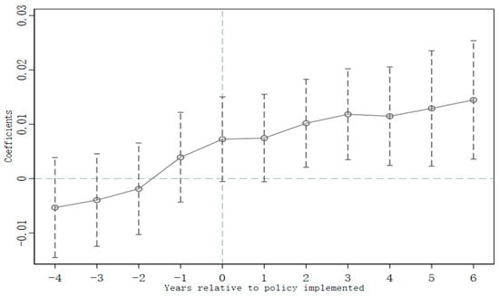 In this paper, the double difference model is used to test the parallel trend, and, since the big data comprehensive pilot zone began to be implemented in 2015, 2015 is selected as the time boundary to analyse the ecological effect of the big data comprehensive pilot zone from 2011 to 2021. In the formula, Big_datait is the policy variables, βk is the impact coefficient of the big data comprehensive pilot zone on ecological resilience in different years, and the value range of k is set to −4 ≤ k ≤ 6. The other variables are assigned the same meanings as in the previous regression equation.